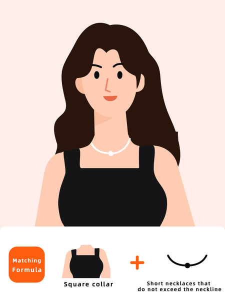 The square collar is already very linear. It is recommended to match it with a soft necklace, and it should not exceed the neckline to avoid too complicated lines.
