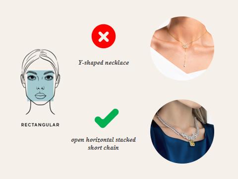 If the jewelry is matched properly, a rectangular face is very domineering and royal. So a rectangular face is suitable for a more gorgeous, layered short necklace. Even if you choose a long necklace, you should also choose an open, horizontal U-shaped necklace and refuse a Y-shaped necklace.