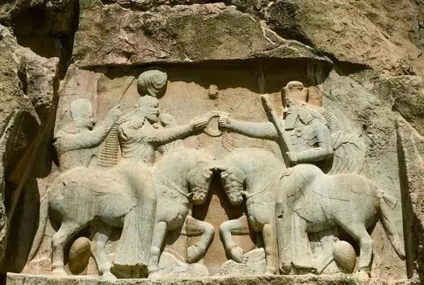 Sassanid cliff carvings in Nakssi-Rustum, Iran, depicting Ahura Mazda passing the ring representing kingship to Adashir.