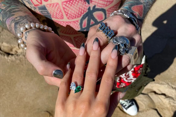 Unlike the "Me and You" ring, which used to set two gemstones in a single band, Meghan's diamond engagement ring is a combination of two rings. For this ring, MGK said: The magnet at the base of the ring perfectly combines the diamond with Colombian emerald, like two halves in the shape of a heart, embedded in the shape of our love.