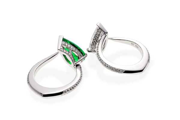 Designed by MGK and British jewelry brand Stephen Webster, the engagement ring is a classic "me and you" double-stone style: an oil-free pear-shaped Colombian emerald, Meghan's birthstone; An antique D-colored pear-shaped diamond that is MGK's birthstone. The two gemstones represent two souls with similar tastes, romantic and commemorative.