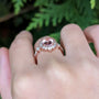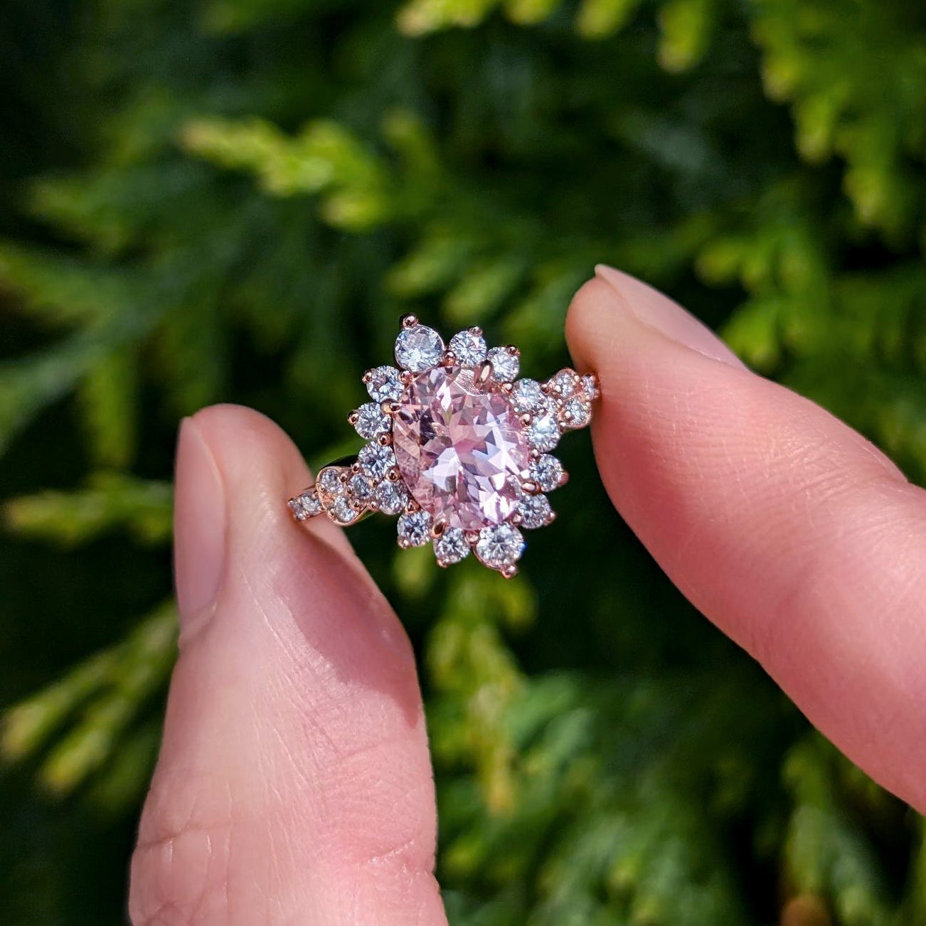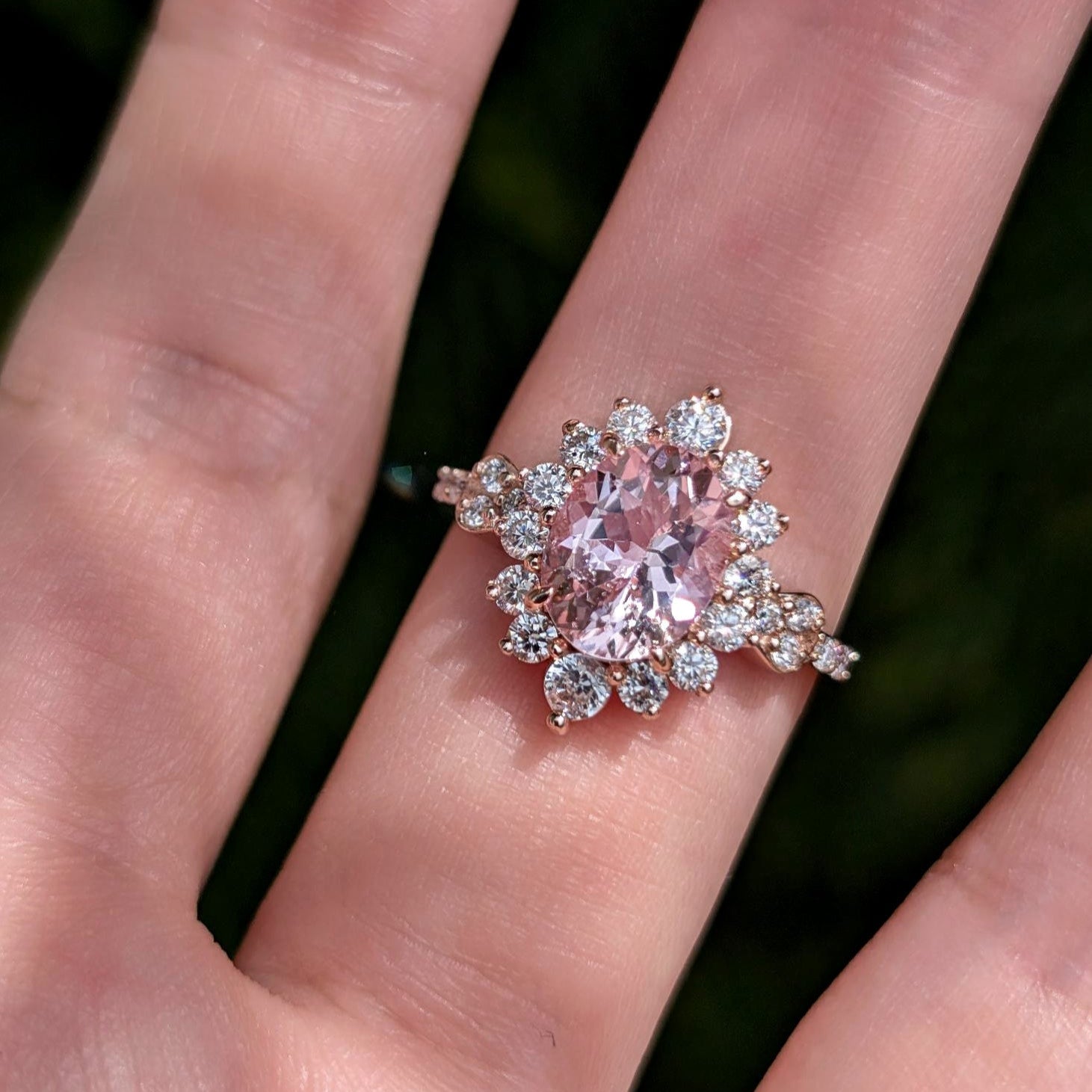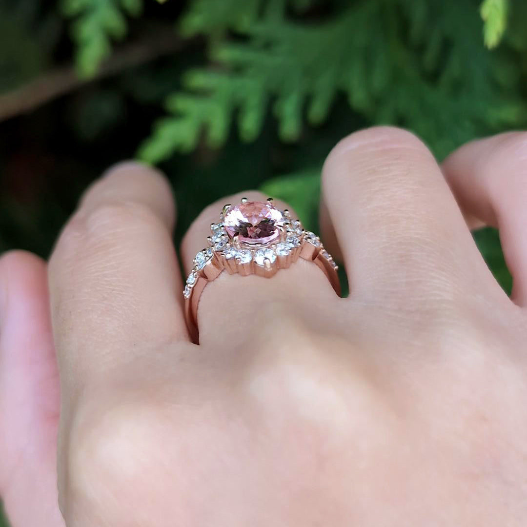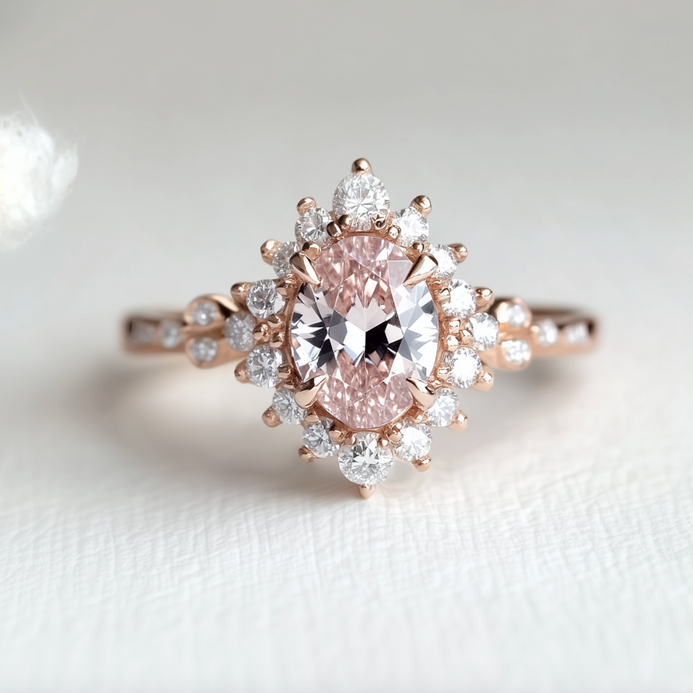 Verlobungsring mit ovalem, rosafarbenem Edelstein und Halo-Fassung von Aurora