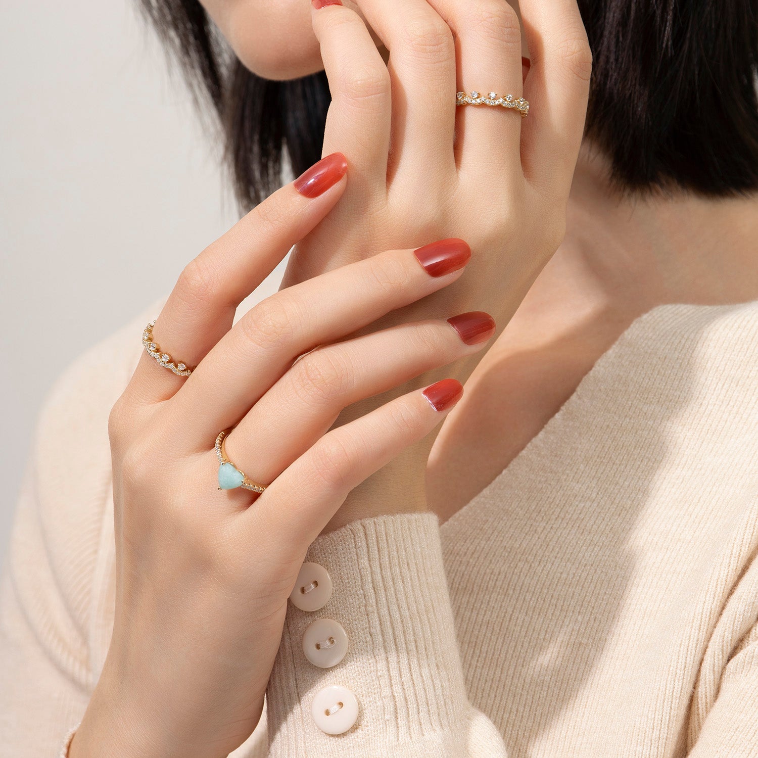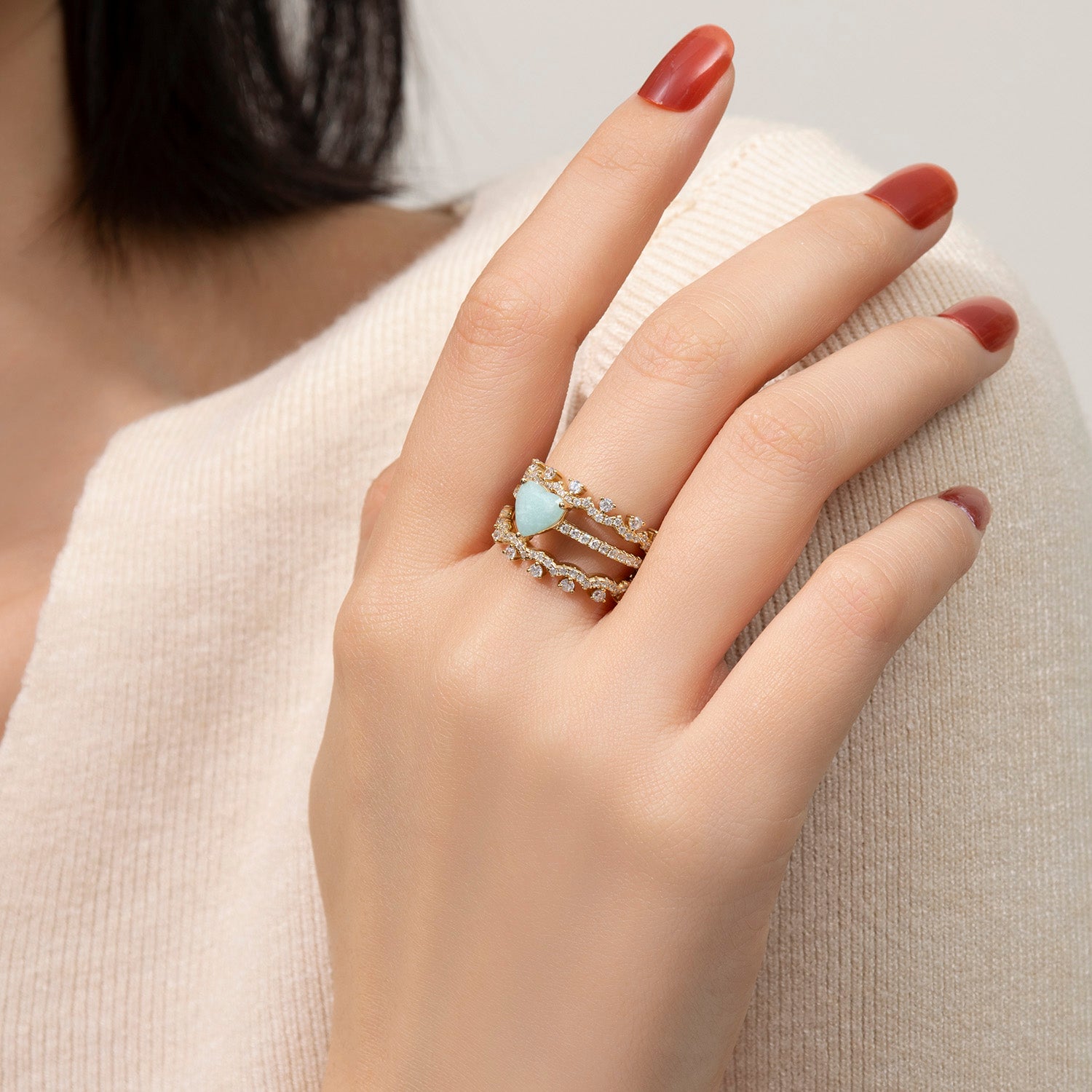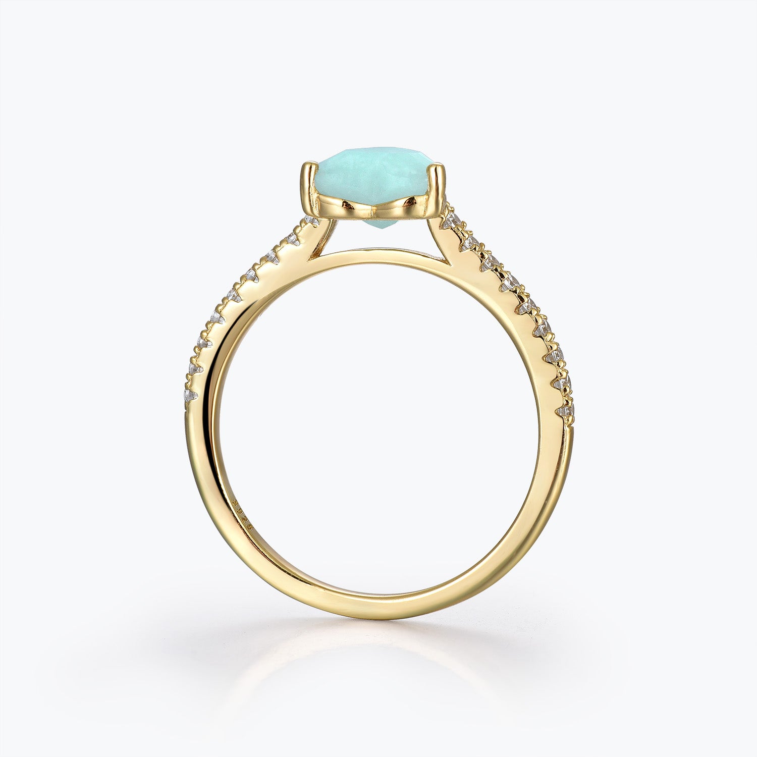 Der Star des Schmuckstücks ist ein atemberaubender, 2,0 Karat schwerer, herzförmiger Amazonit aus Naturmaterial, der fachmännisch in ein Halbpavé-Band eingefasst ist und diesem ohnehin schon beeindruckenden Stück genau das richtige Maß an Glanz verleiht.