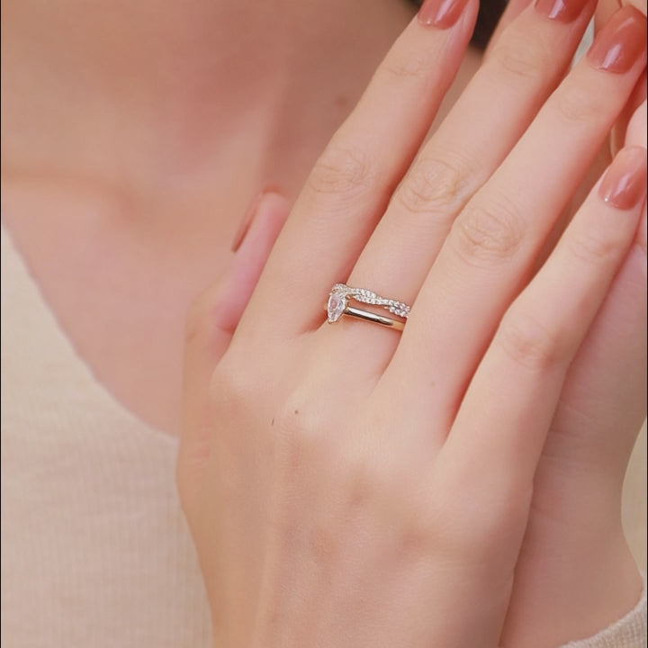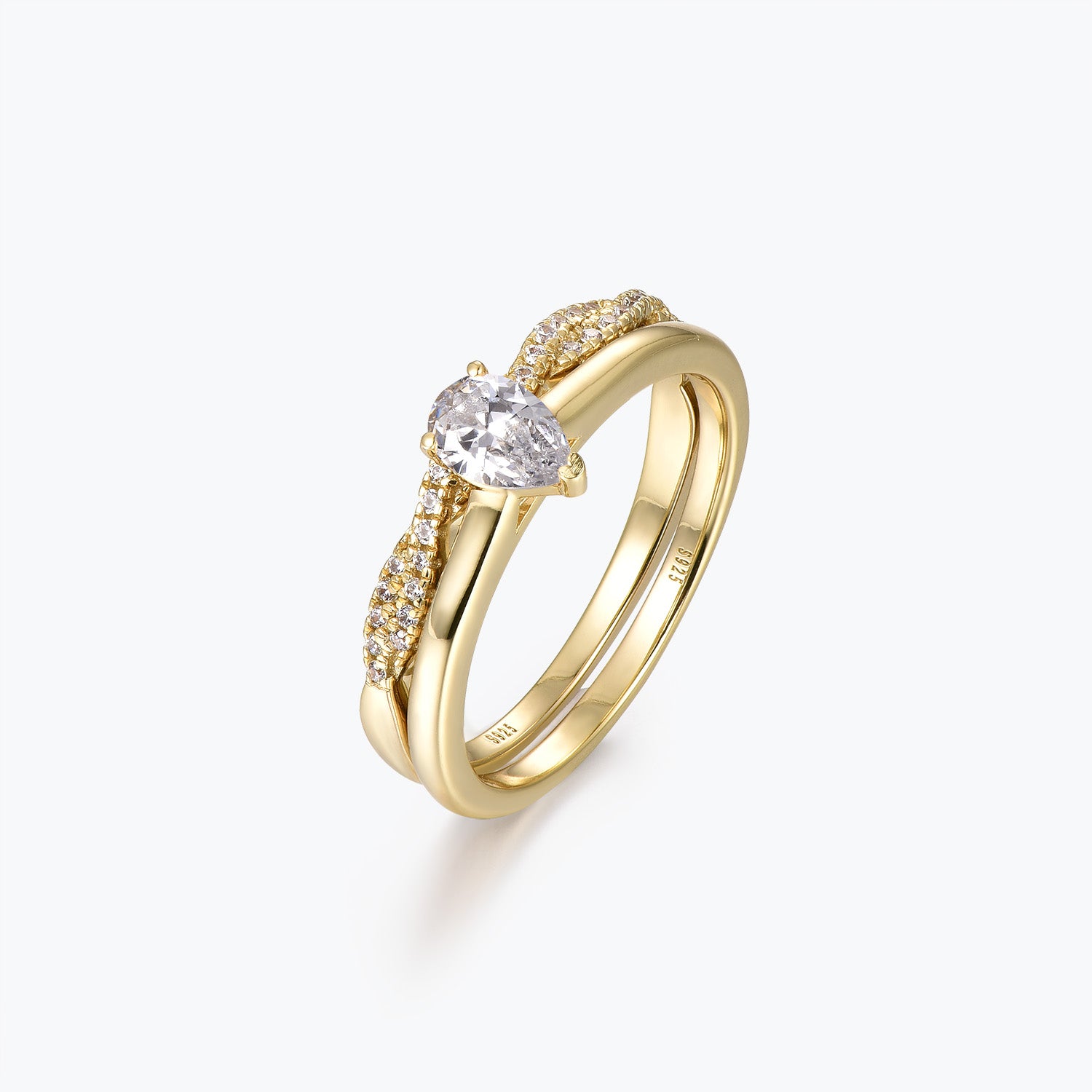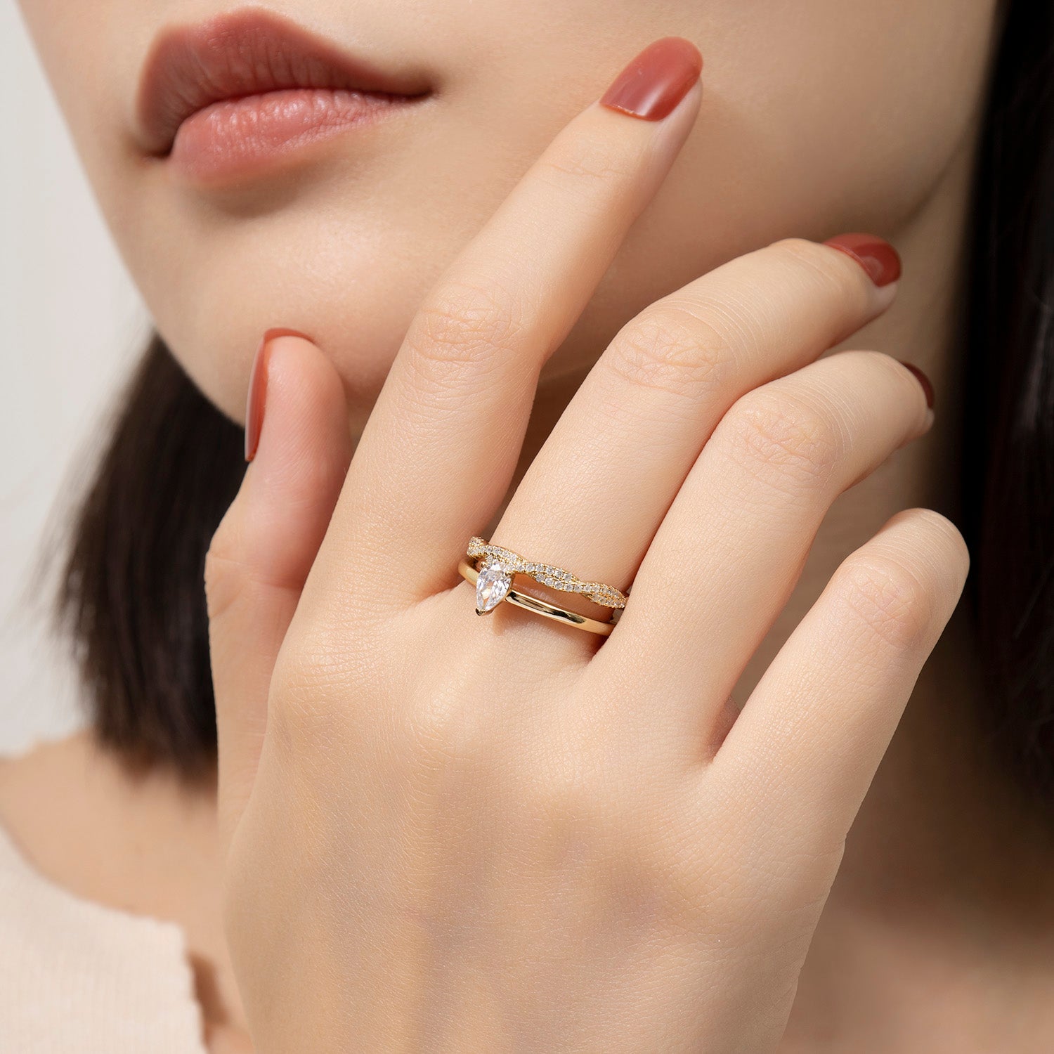Dissoo® Gold Birnenförmiger Solitär-Moissanit-Verlobungsring und Crossover-Pavé-Ehering