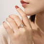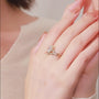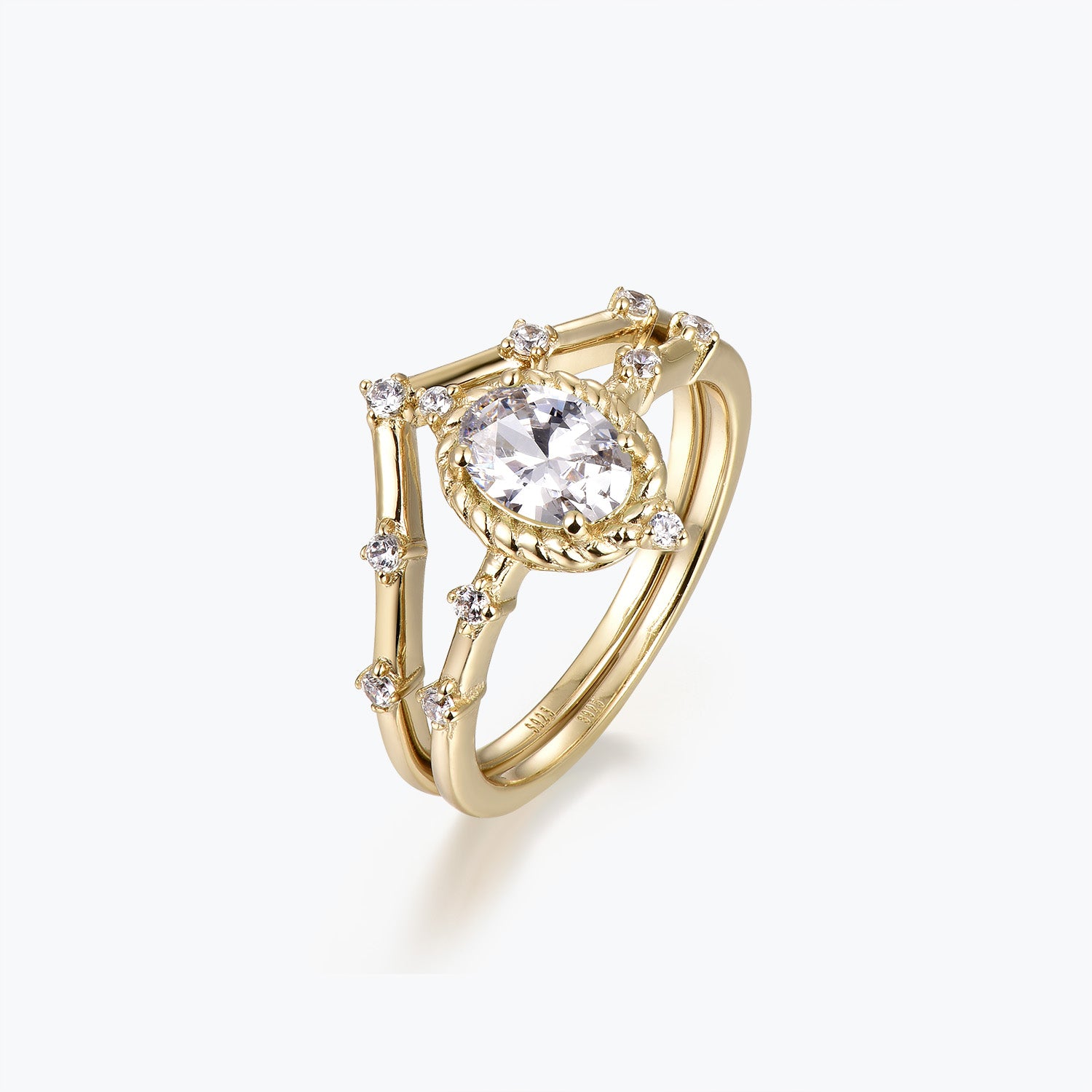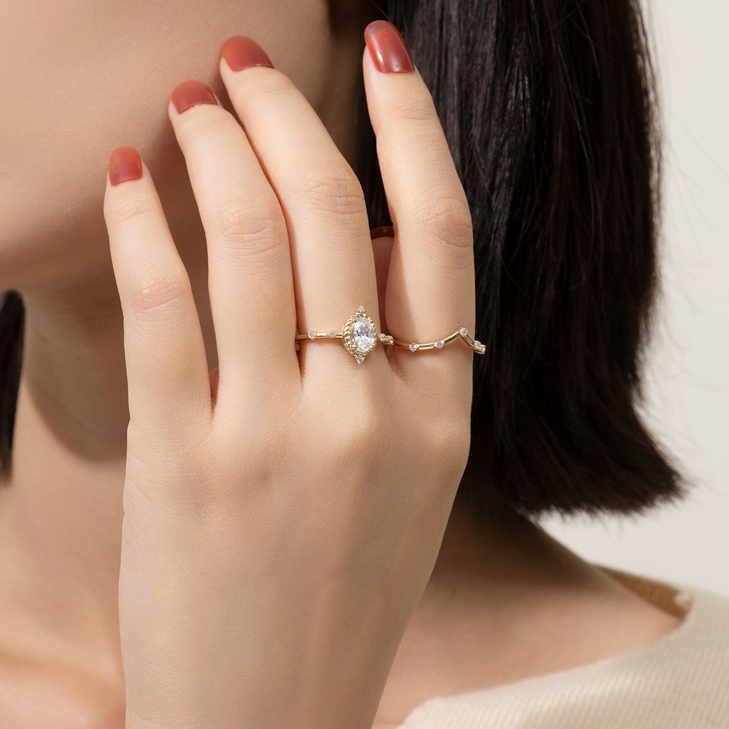 Dieses Set beinhaltet außerdem einen wunderschönen, geschwungenen Weidenring, dessen einzigartiges und filigranes Design perfekt zum Verlobungsring passt. Die geschwungene Ringschiene ist mit fünf funkelnden, kleinen, runden Moissaniten besetzt, die diesem ohnehin schon atemberaubenden Set noch mehr Glanz verleihen.