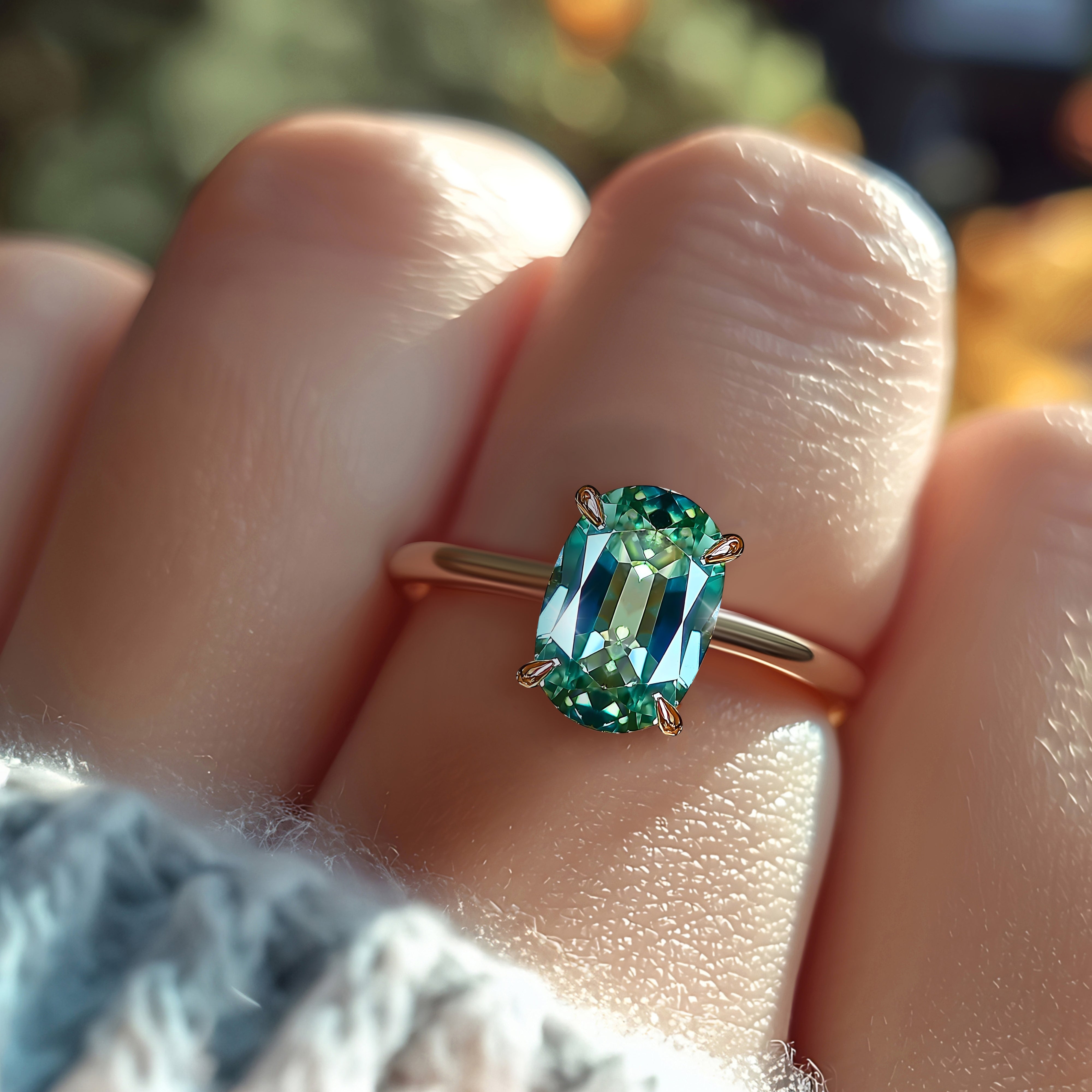 Im Mittelpunkt steht ein atemberaubender, farbloser Ovalschliff. Im Labor gezüchteter Edelstein. Er ist in einer Krappenfassung sicher befestigt und bringt so all seine schönsten Facetten zur Geltung.