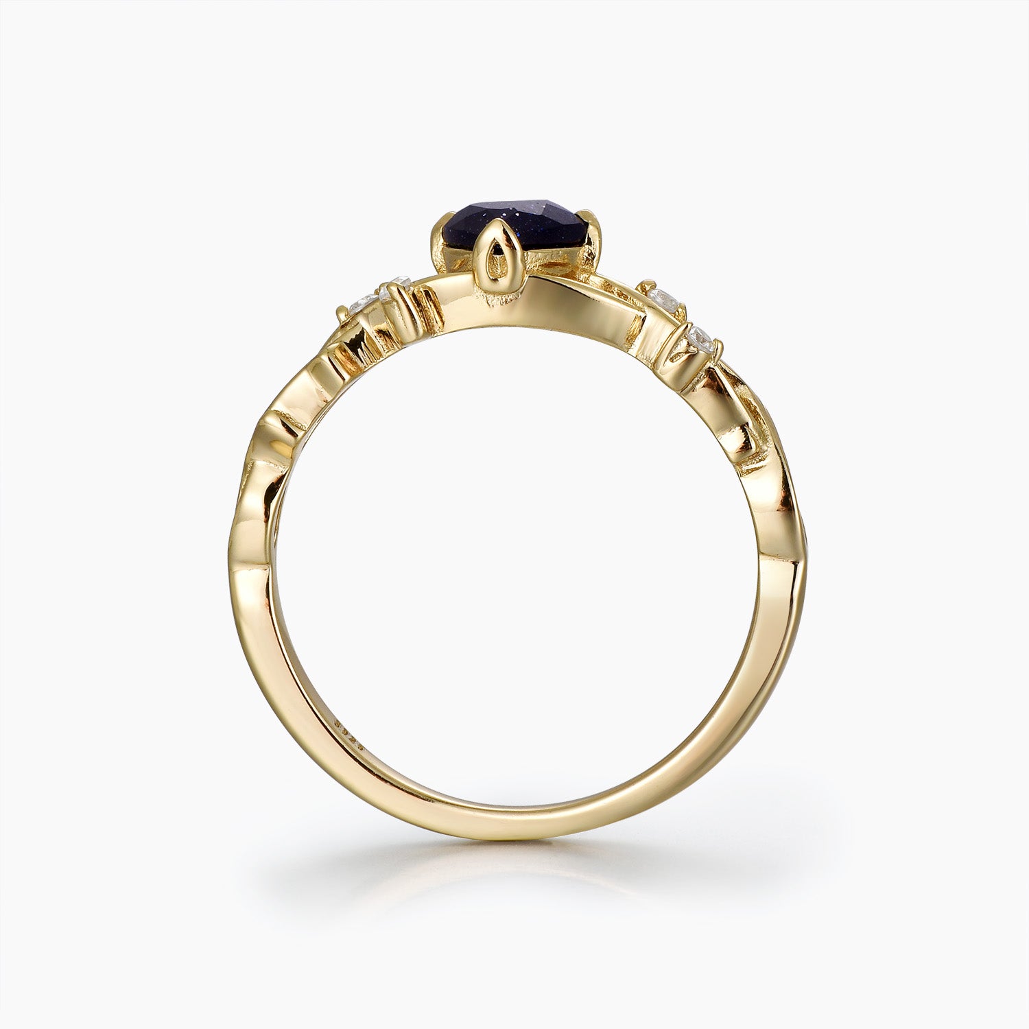 Der Verlobungsring besticht durch einen atemberaubenden, 0,5 ct schweren, herzförmigen blauen Goldflussstern im Zentrum, umgeben von kunstvoll gestalteten Blättern, die ewige Liebe symbolisieren. Funkelnde Mini-Moissanit-Steine entlang der edlen Goldranke verleihen dem Schmuckstück einen Hauch von Glamour und Eleganz. Das geschwungene Weidenmotiv wirkt verspielt und zugleich elegant und macht den Ring perfekt für die unkonventionelle Braut.