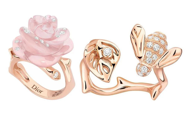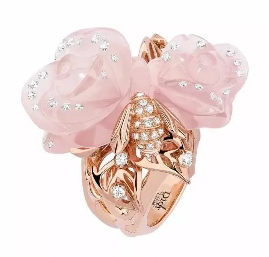 In the Rose Dior Pré Catelan series ring, the bee stays playfully and cutely next to the rose, forming a romantic and quiet scene.