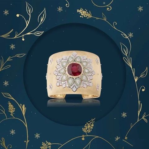 The Dans du Fau bracelet uses "rose" as the image, and uses an 18.52ct cushion-cut red tourmaline to interpret the stamen, and the surrounding drop-shaped petals are embellished with electric-optic blue Paraiba tourmalines, and white gold and diamonds are used to outline the outward-blooming cusps Angular petals, bright colors create a rich visual hierarchy.