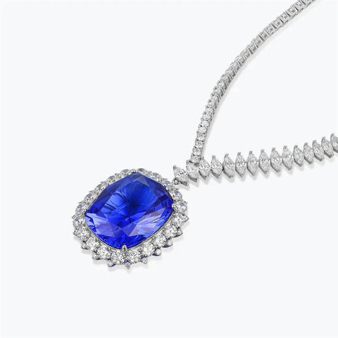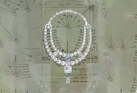 Designed by Cartier for the Maharaja of Nawanagar in 1931, the necklace is named after Cartier's legendary jewelry designer. The necklace is composed of a blue and white diamond with a main diamond of 136.25 carats, 46 white diamonds and two baguette-cut pink diamonds of 13 and 14 carats respectively. The original necklace was designed for the monarch, so the replica version that appeared in the movie was scaled down to fit the female lead's figure.