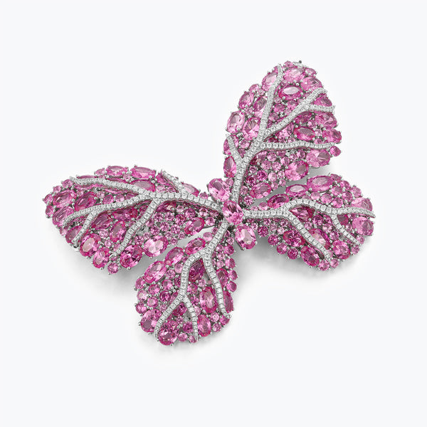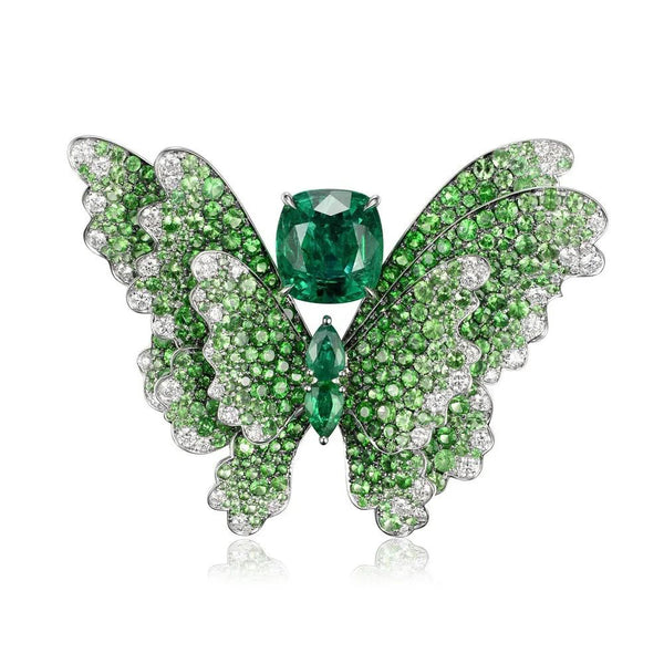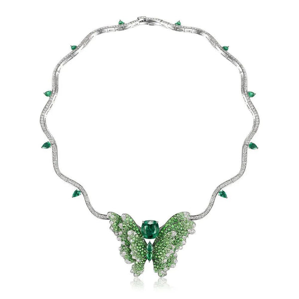 The body of the butterfly is inlaid with emeralds, spessartites, pink tourmalines and white sapphires, and the wings of the butterfly are covered with colorful sapphires, tanzanites, emeralds and diamonds in colorful and bright colors; the butterfly necklace is made of diamonds, tsavorites The stone pavement emits a gradient of hues, and the cushion-shaped emeralds set between the wings become the focus of attention.