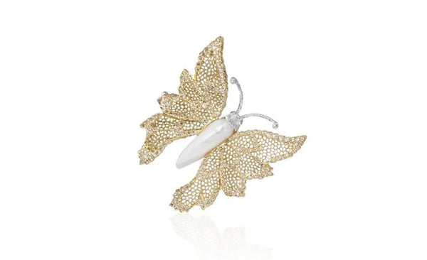The wings of this butterfly brooch use the prestigious Buccellati Tulle tulle technique. Each hollow hole on the butterfly wings must go through 9 processes to complete, and only in this way can the lines of the butterfly wings be vividly depicted . The 18K gold hollow wings are dotted with beautiful diamonds, which are extremely dazzling. The head and tentacles of the butterfly are made of 18K white gold, and the body of the butterfly is made of a slender baroque pearl. The overall shape gives people a sense of agility. Butterflies spread their wings and dance in the air, showing infinite lightness.