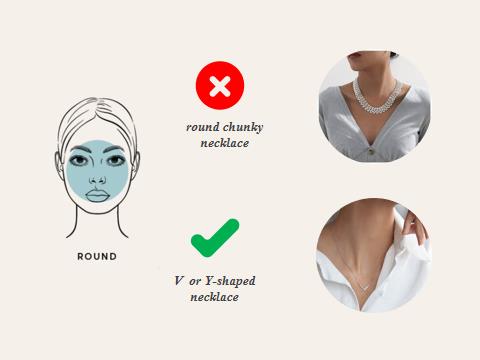 Necklaces with V-shaped, Y-shaped or parts are very suitable for round faces, which will reduce the roundness of the face, reduce the sensuality brought by the round face, and look delicate and lovely.