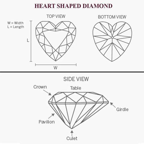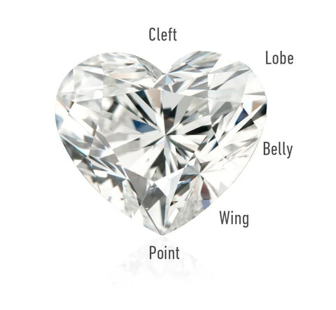 The classic heart cut diamond is composed of two symmetrical winged flaps, a central notch and a sharp corner at the bottom. When viewed from the table, the two shoulders should have a rounded shape.