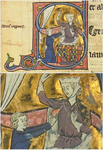 A 13th century French love story codex, Le Roman de la Poire, depicts a young man on his knees offering a heart to a young girl he adores.