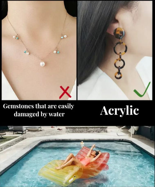 Before playing in the water, please take off the jewelry and store them properly, especially water-repellent gems such as pearls. Gems such as lapis lazuli, turquoise and honey wax are easy to be damaged in hot water. Plated jewelry such as gold or rose gold may also change color or fall off due to the influence of water quality. Chlorine in swimming pools may damage some metals, while seawater may cause corrosion. Therefore, it is best to take off the jewelry before entering water.
