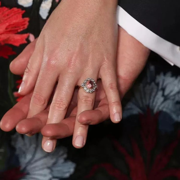 Princess Eugenie's engagement ring features a Padparadscha sapphire surrounded by 12 diamonds. It is said that the ring was designed by Brooksbank and Princess Eugenie together.