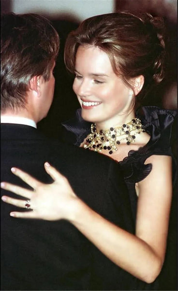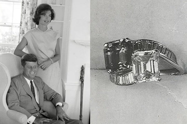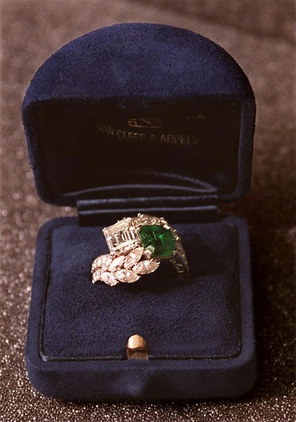 U.S. President John F. Kennedy purchased his wife Jacqueline's engagement ring from Van Cleef & Arpels in 1953. The vintage-inspired ring featured a 2.88-carat diamond and a 2.84-carat emerald as the main stones, with T-shaped diamonds set into the band.