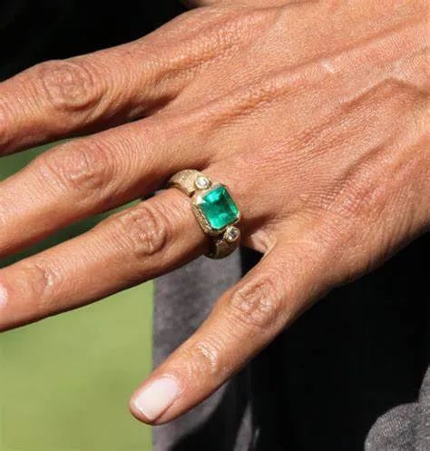 Her engagement ring features a simple, bold design, hand-forged by famous French jeweler Robert Mazio, with a square-cut emerald as the main stone.