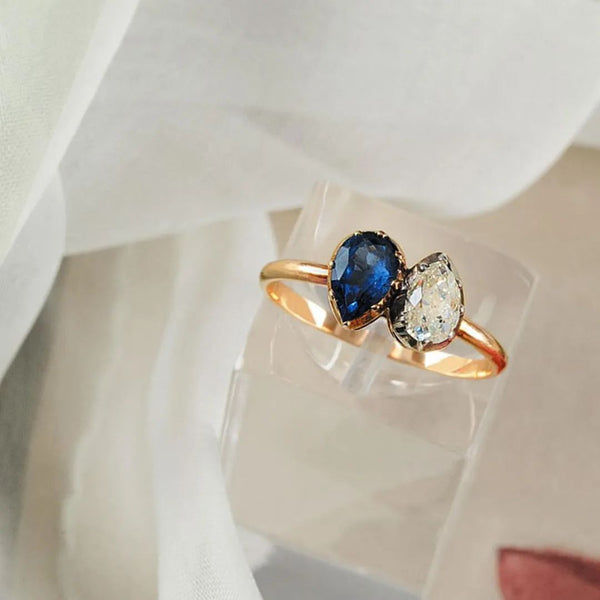This 18th-century gold ring features two side-by-side gems - a 1-carat pear-shaped diamond and a 1-carat blue sapphire - facing opposite directions, with the phrase "destined" engraved on the inner band, symbolizing "you and me."