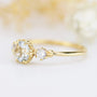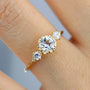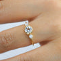 A serene round-cut lab-grown aquamarine glows at the center of this elegant three-stone engagement ring, its clear blue hue symbolizing calm devotion and enduring love. Flanked by two radiant side stones, the trio represents the past, present, and future—each moment beautifully connected.