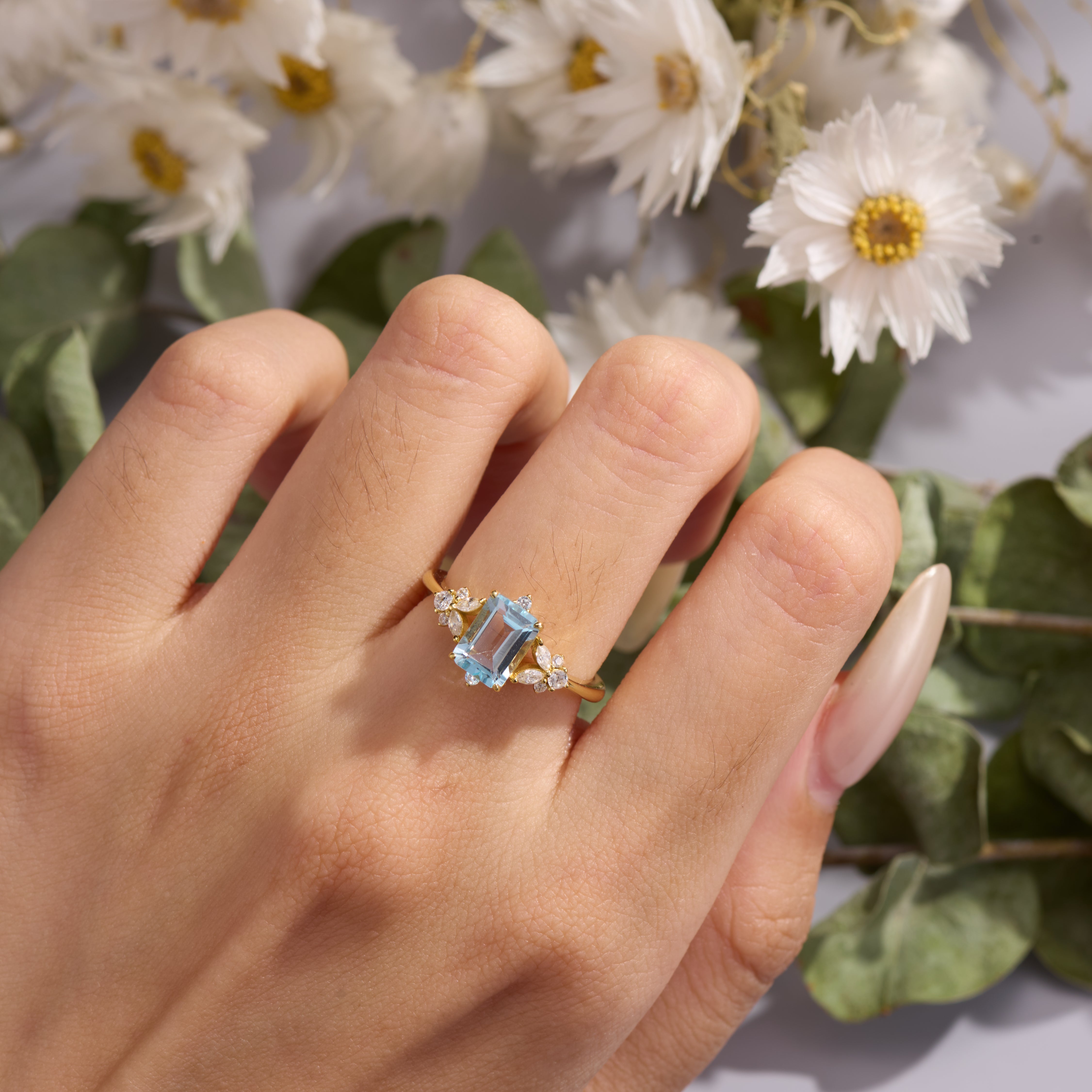 Élégante et intemporelle, la bague Rosetta est ornée d'une topaze taillée en émeraude d'inspiration vintage , caractérisée par des lignes raffinées et un charme classique. Les facettes en escalier rehaussent la clarté et la douce brillance de la pierre, évoquant le romantisme des bijoux de famille.