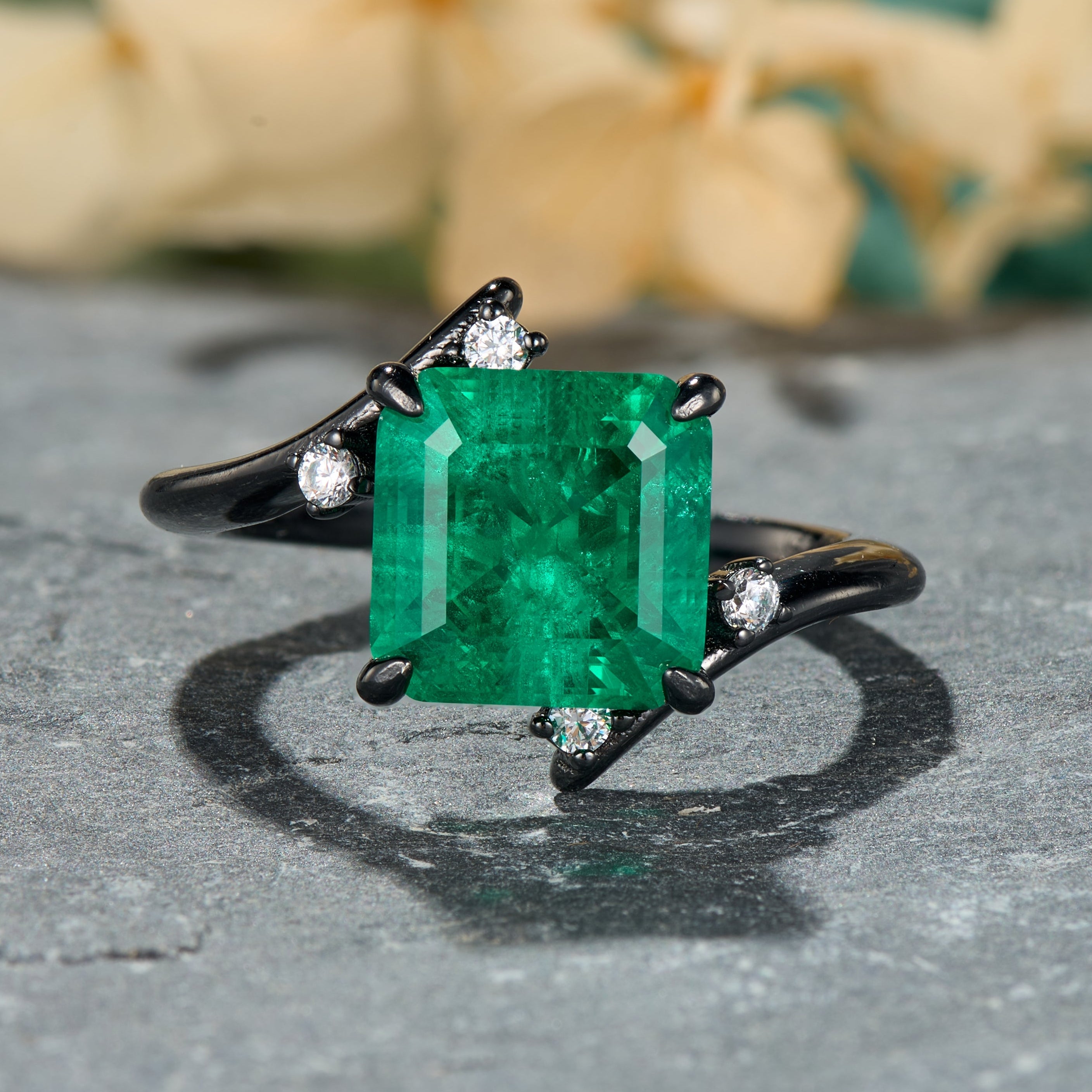 Bague Julissa en or noir avec émeraude de laboratoire taille princesse et texture craquelée