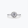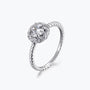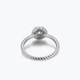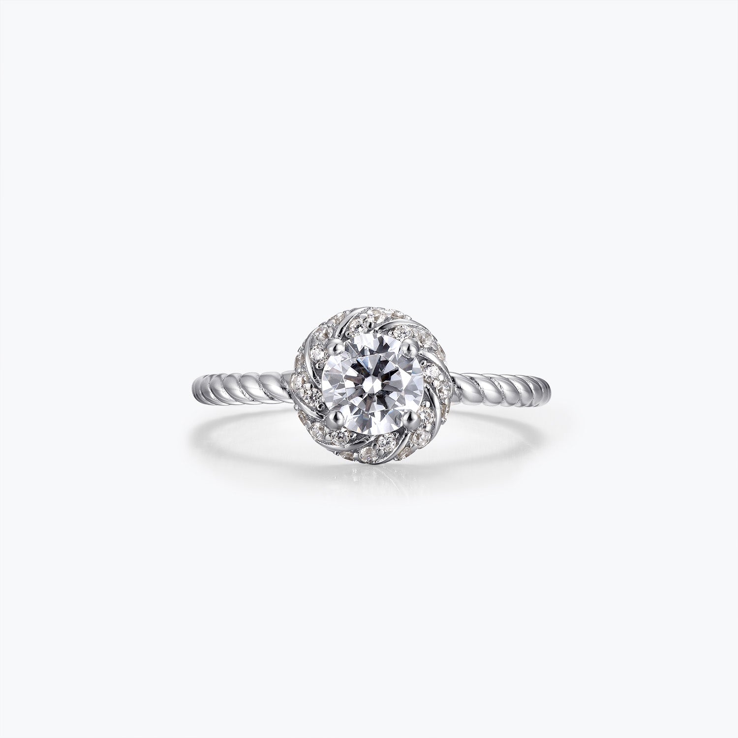 La moissanite ronde et étincelante qui orne le centre de la bague scintille de mille feux, rappelant le diamant, mais avec une brillance et une pureté encore supérieures. Le halo en spirale ajoute une touche d'élégance et de raffinement, tandis que l'anneau torsadé symbolise l'amour éternel.