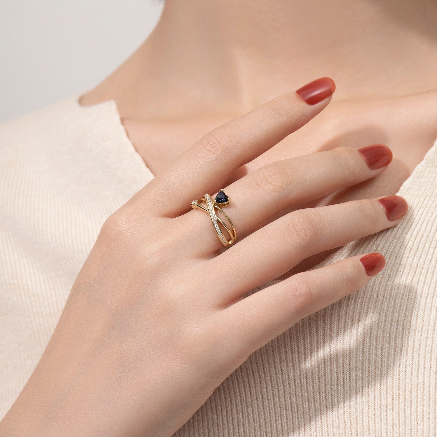 Romantic with a modern edge, the crossover design amplifies the stone’s celestial glow—each shimmer reflecting passion, destiny, and a love written in the stars.