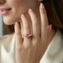 Romantic, graceful, and endlessly captivating — The Elowyn embodies pure feminine elegance. At its heart, a emerald-cut rose pink gemstone shimmers with soft blush tones, symbolizing love, tenderness, and new beginnings. The emerald cut highlights the gem’s refined clarity and timeless geometry, creating a look that feels both modern and classic.
