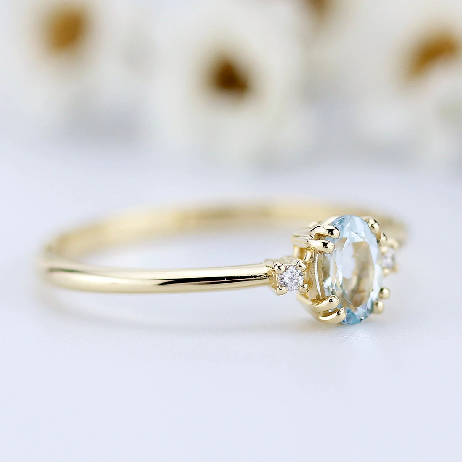 A luminous oval-cut lab-grown aquamarine takes center stage in the Valoria ring, its tranquil blue hue symbolizing clarity and lasting devotion. Flanked by two shimmering side stones, the three-stone setting represents the past, present, and future—each moment joined in perfect harmony.